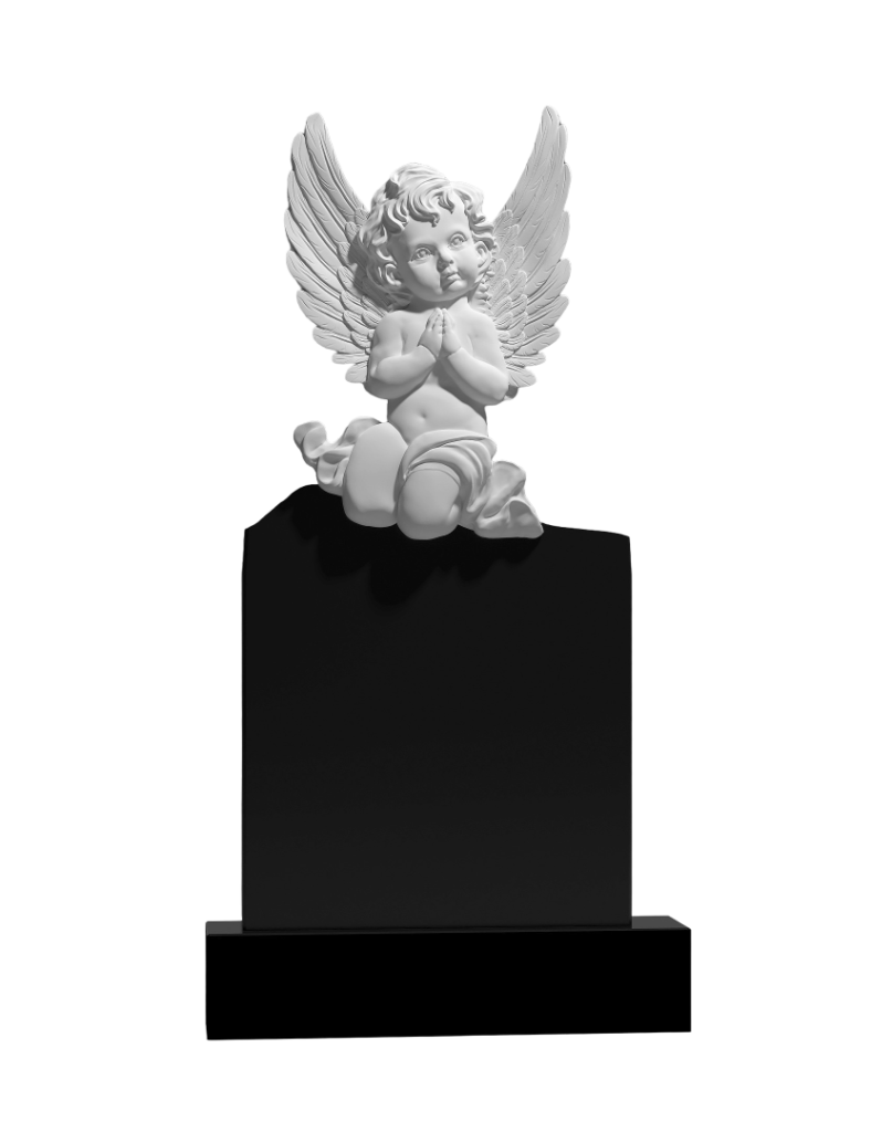 На вершине этого вертикального памятника сидит на коленях маленький резной ангелочек. Его крылышки нежно расправлены, создавая образ лёгкости и небесной чистоты, а руки сложены в молитве — жест смирения, надежды и духовного обращения. Фигурка передана с детальной проработкой черт лица, складок одежды и перьев, что демонстрирует высокое мастерство резчика и придаёт образу трогательную живость. Ангелочек, расположенный на вершине, символизирует душу усопшего, особенно ребёнка, обретшую покой и пребывающую в состоянии вечной молитвы под покровом небес. Памятник создаёт пространство для светлой, умиротворённой памяти, где можно почтить ушедшего, представляя его в этом невинном и прекрасном образе, который говорит о мире, вере и тихой радости за гранью земного. Это выбор для тех, кто ищет в надгробии сочетание лирической нежности, глубокой духовности и виртуозного художественного исполнения.