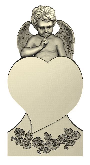Монумент выполнен в форме сердца, чьё основание украшено резным цветочным орнаментом. Этот элемент, лишённый излишней пышности, символизирует вечное цветение и нежную память. На вершине композиции расположена фигура ребёнка-ангела с небольшими, аккуратными крыльями. Ангел изображён в состоянии безмятежного покоя, его поза и выражение передают детскую чистоту и смирение, словно он бережно хранит то, что находится под его опекой. Лаконичность формы сердца и сдержанная декоративность его основания фокусируют внимание на центральном образе, создавая целостную и уравновешенную картину. Памятник воплощает идею невинной заботы и тихой, непрекращающейся любви, где скорбь преображена в образ вечного, светлого умиротворения. Это элегантное и трогательное решение, создающее пространство для личного воспоминания, наполненного тишиной и покоем.