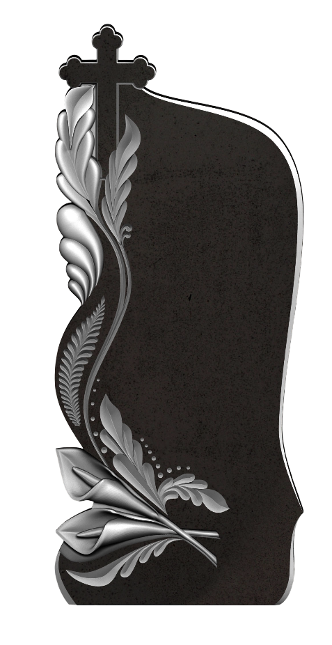 Вертикальный памятник отличается выразительной, изгибистой формой, которая придаёт его силуэту динамичную пластику и своеобразную элегантность. Основание монумента украшено парой резных цветов, уложенных с тонкой детализацией, что символизирует укоренённую память и начальную точку композиции. Левая сторона памятника развивает эту тему, превращаясь в стилизованный стебель с резными листьями, которые плавно поднимаются вверх. Эти листья образуют лёгкий, ажурный покров, завершающийся в верхнем углу, где укрыт крест. Символ веры оказывается органично интегрирован в природный мотив, словно вырастая из него и находя под его сенью защиту и завершение. Памятник воплощает идею роста, защиты и гармоничного единства земной красоты с духовной высотой, создавая пространство для созерцательного покоя, где каждый элемент повествует о непрерывной связи жизни, памяти и вечности.